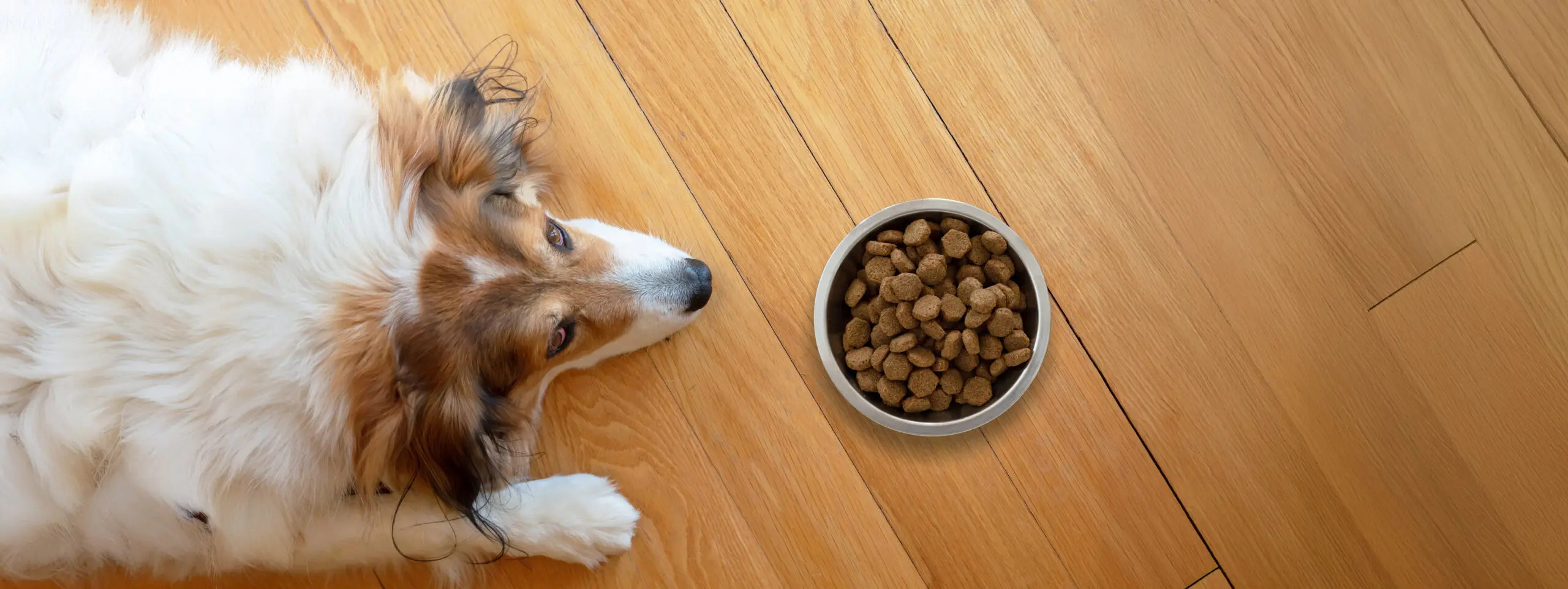 Pet anorexia, dog is sick or bored. Sshepherd dog and a bowl with dry food on wooden floor background, top view